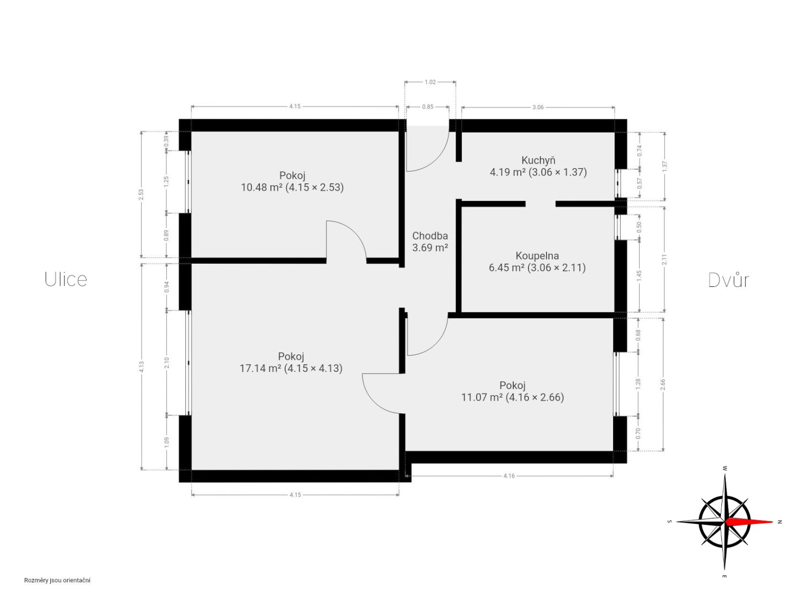 zhruba 10 m² jsou orientované do jednosměrné ulice na jižní světovou