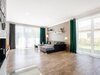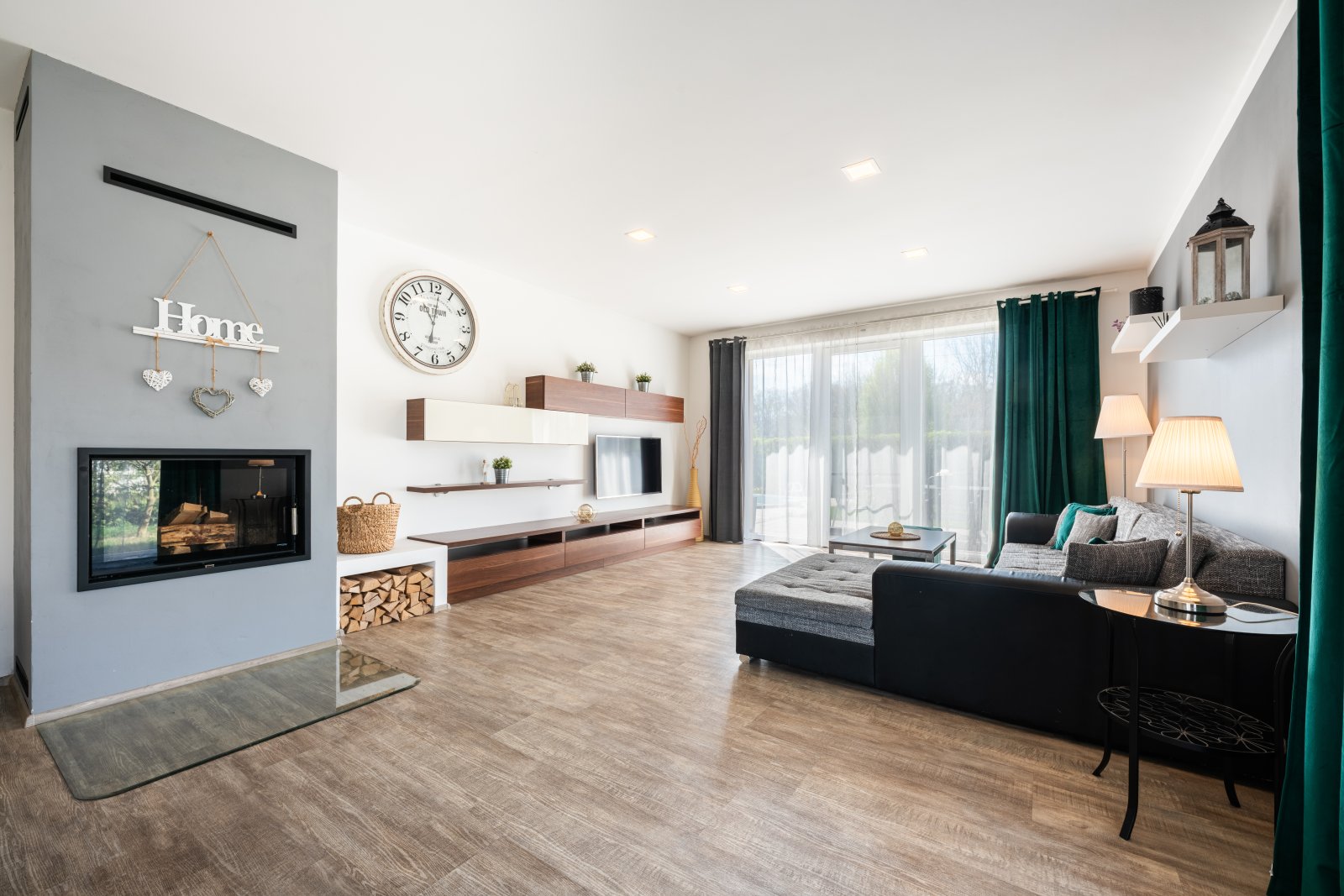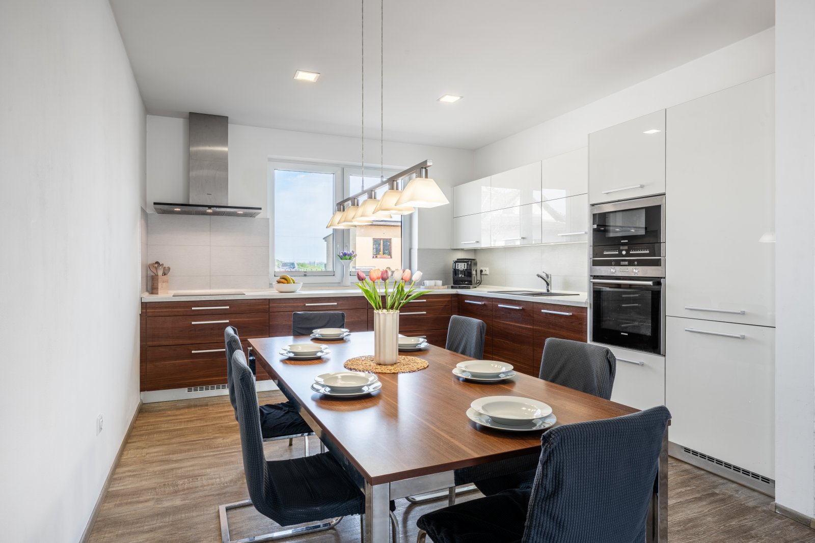 pravé straně se nachází velkorysý obývací pokoj propojený s kuchyní a
