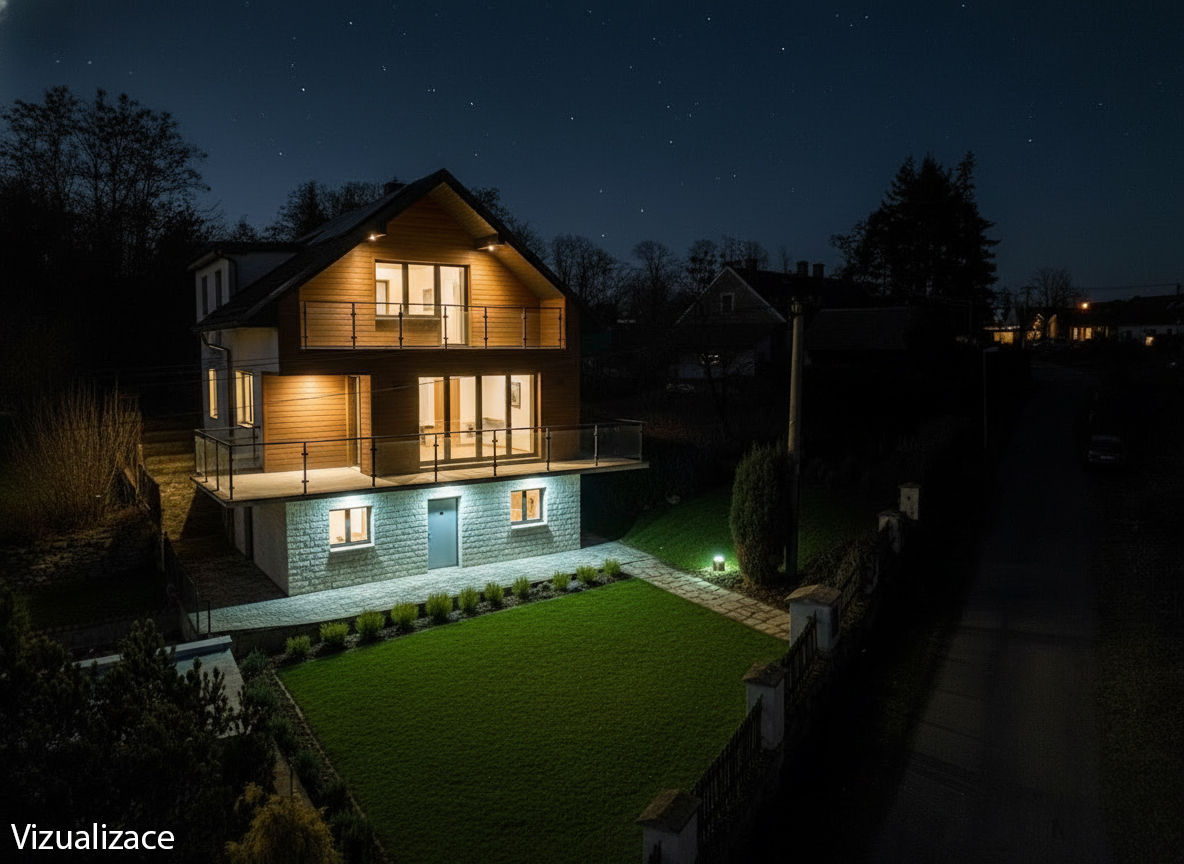 V přízemí se nachází prostorný obývací pokoj s jídelnou, kuchyň,
