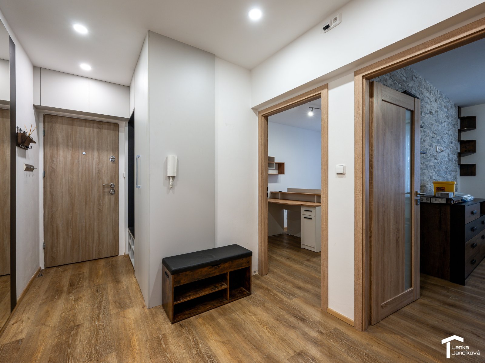 Po vstupu do bytu se ocitáme v chodbě, kde je umístěna vestavěná šatní